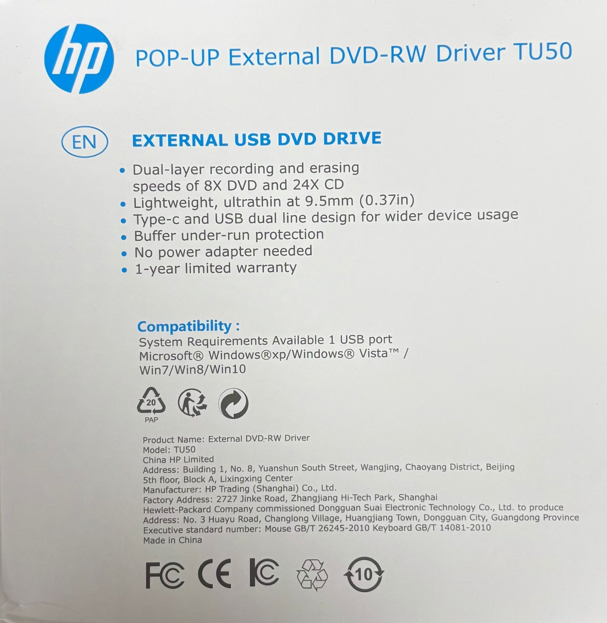HP POP-UP EXTERNAL DVD-RW DRIVER TU50