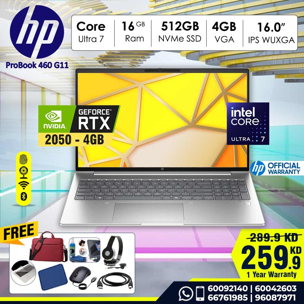 Laptop HP ProBook 460 G11 | Intel Ultra 7 155H | 16 GB DDR5 RAM | 512 GB NVME SSD Storage | NVDIA RTX 2050 4GB VGA Dedicated | 16”-inch WUXGA IPS Screen | Dos | 1 year Warranty