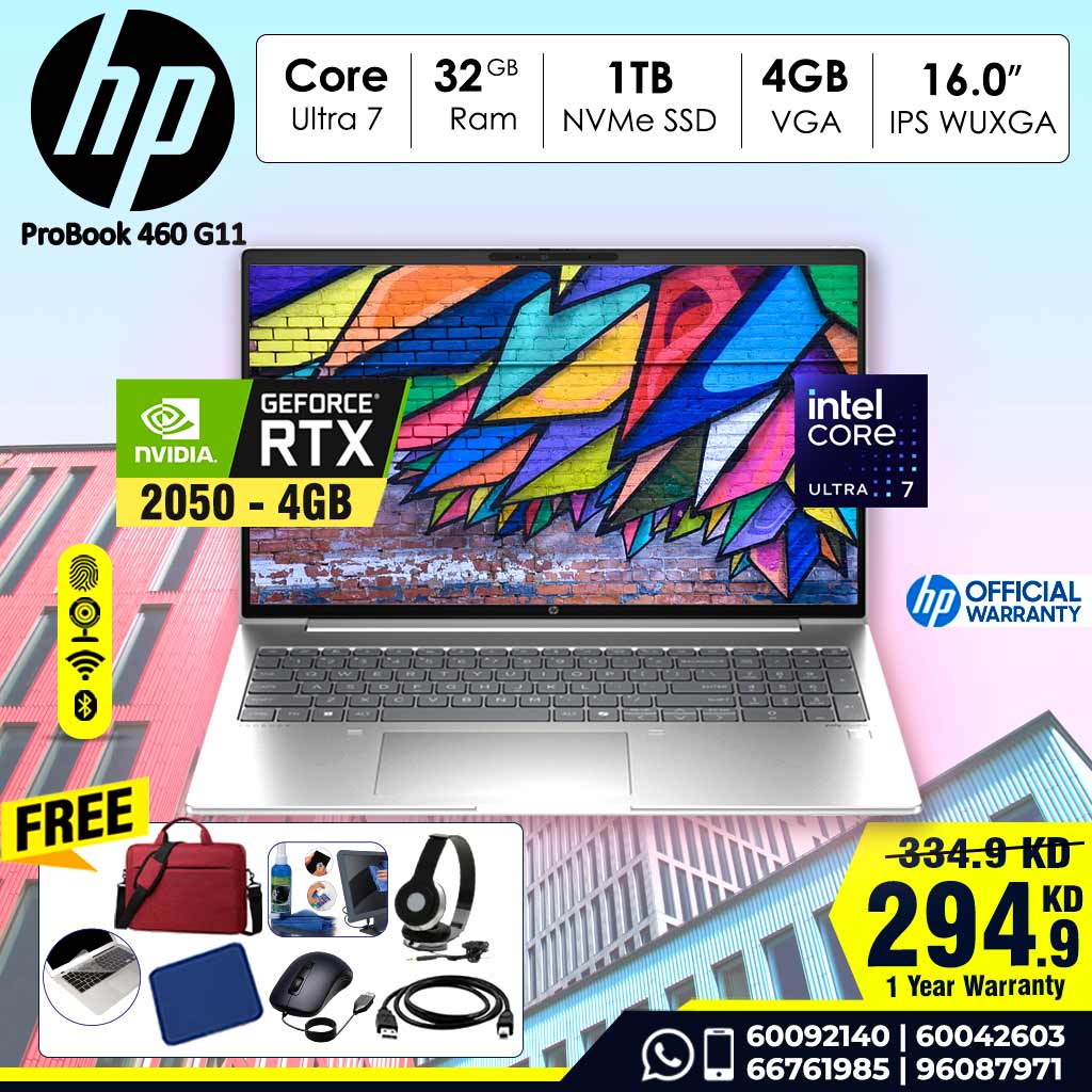 Laptop HP ProBook 460 G11 | Intel Ultra 7 155H | 32 GB DDR5 RAM | 1TB NVME SSD Storage | NVDIA RTX 2050 4GB VGA Dedicated | 16”-inch WUXGA IPS Screen | Dos | 1 year Warranty