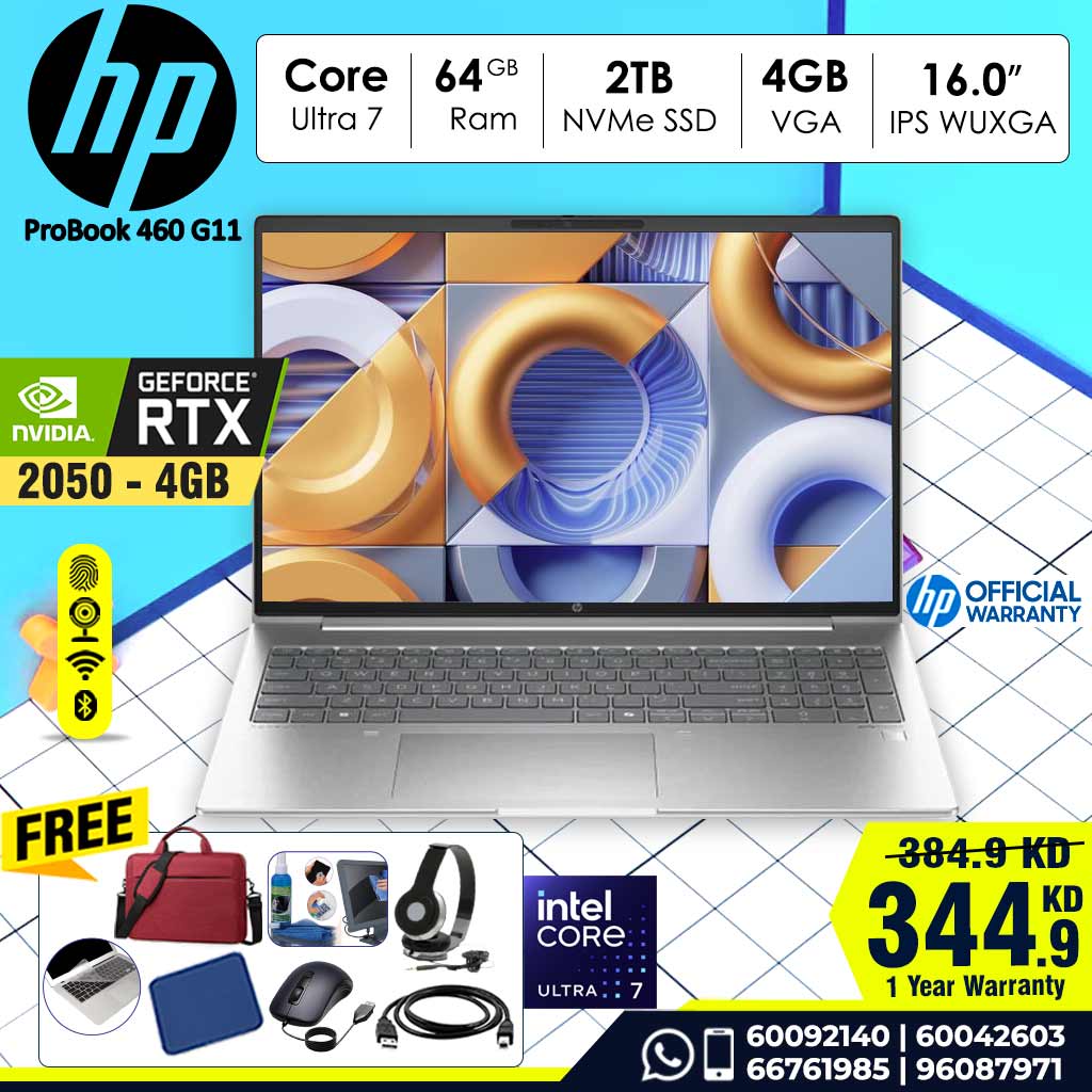 Laptop HP ProBook 460 G10 | Intel Ultra 7 155H | 64 GB DDR5 RAM | 2TB NVME SSD Storage | NVDIA RTX 2050 4GB VGA Dedicated | 16”-inch WUXGA IPS Screen | Dos | 1 year Warranty